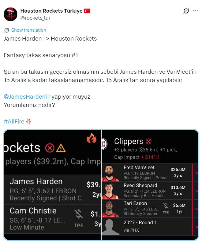 休媒为火箭、快船模拟了一套方案: