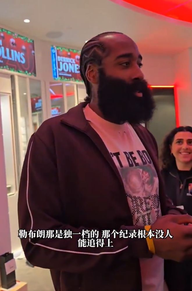 谈到自己生涯总得分目前已经在历史前十,哈登打趣道:“别提了,别把勒布朗扯进这个话题,没人能追上勒布朗。”