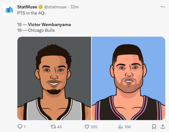 文班亚马在末节8中6+三分3中3,拿到18分5篮板,他带领马刺打出32-19的攻防浪潮,公牛全队末节只有19分,武切维奇没有在内线进过球,这就是文班亚马的统治力。