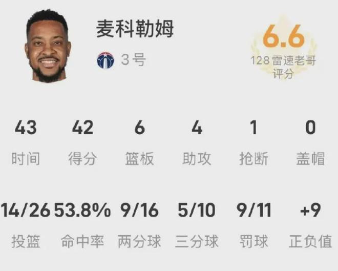 CJ·迈克勒姆“老夫聊发少年狂”,单场狂轰42分6篮板4助攻1抢断,差点就率领奇才在底特律抢下一场胜利,但康宁汉姆没答应。