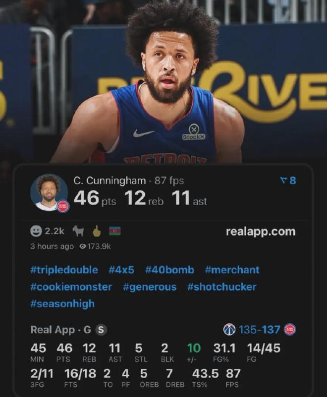 康宁汉姆全场独得46分12篮板11助攻5抢断2封盖的三双数据,虽然投篮铁了一点,但至少他带队赢球了,赢球才是硬道理。
