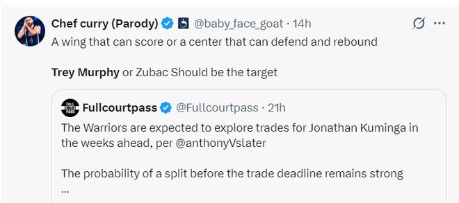 当即就有勇士媒体转推写道:勇士需要一个能够得分的侧翼球员合一个既能防守又能抢篮板的中锋球员,特雷-墨菲与祖巴茨应该是重点关注的对象。